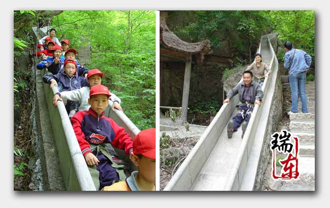 滑道是一種無載人工具滑道,靠重力自然下滑,速度由游客自己控制,安全好玩!是自然景區中一種新型的娛樂與代步為一體的參與性娛樂設施!它是以拋光的花崗巖石為主要材料,依山體坡度修建而成的巨型凹槽。既是老少皆宜的娛樂設施,又是充滿童趣的代步工具。